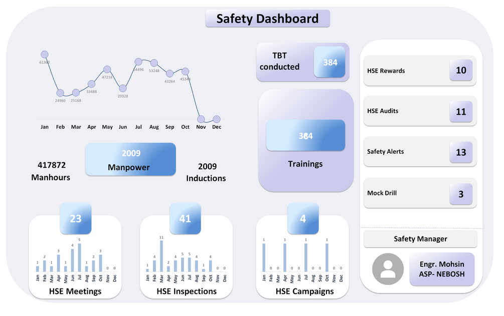 safety dashboard is an excellent template to reflect your QHSE statistics in an infographic and engaging manner. It contains a simple excel sheet where you will enter data and it will populate the dashboard. It requires no technical knowledge and can easily be used by anyone.